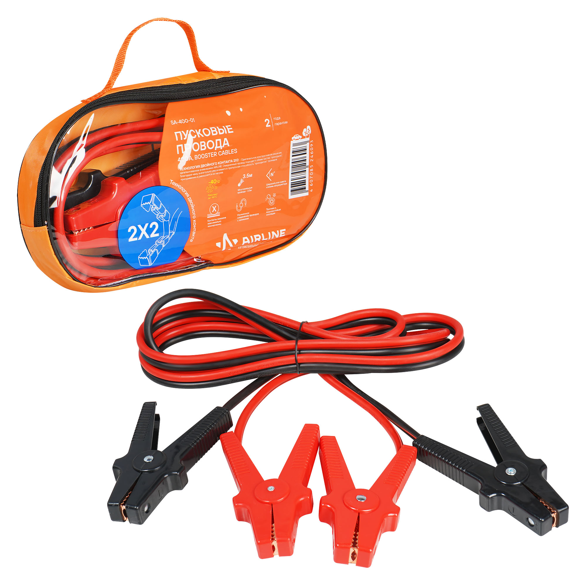 автомобилей, а так же спецтранспорта с разряженной аккумуляторной батареей. Многожильный медный провод длинной 2,5м. позволяет использовать провода для любого коммерческого транспорта, а плавающие крокодилы с максимальной площадью контакта и технологией двойного контакта 2*2 позволят передать энергию с минимальными потерями.