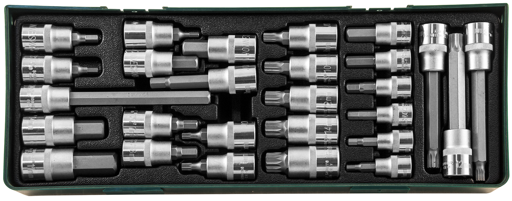 Набор насадок торцевых 3/8" и 1/2"DR с вставками-битами в ложементе, 27 предметов.